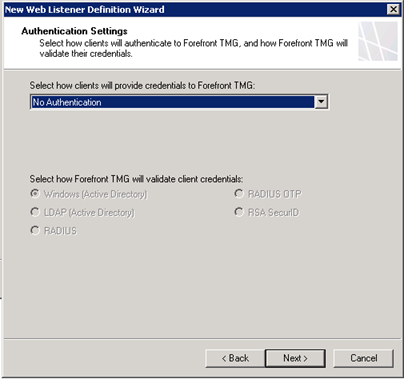 - Again, follow the wizard, Assign a certificate and on the Authentication Setting page, select No Authentication;