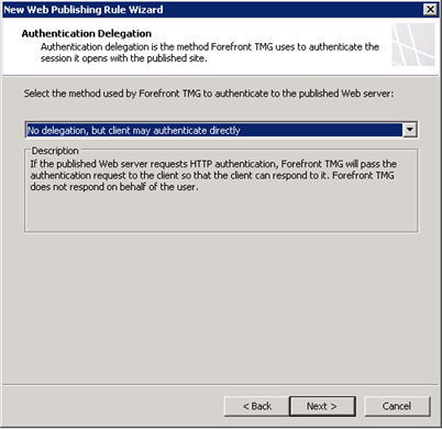 - On the Authentication Delegation page, select No delegation, but client may authenticate directly;