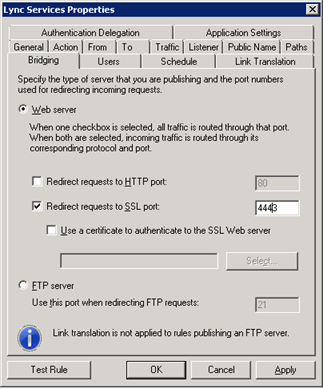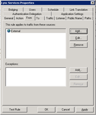 - On the TMG Server, open the Management Console and open the properties of the Lync Services rule that was created in the previous step;