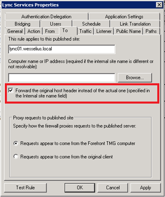So, the lync.wesselius.info FQDN will point to the TMG Server, while the lyncedge.wesselius.info will point to the Lync Edge Server. As you can see in the picture above, the webservice is published on port 4443, so after initial creation of the rule it needs to be changed to reflect this port setting.