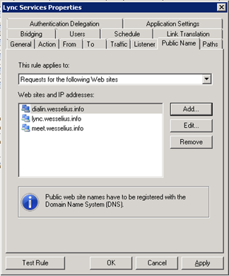 - On the Public Name tab, add the simple URLs (for example, meet.wesselius.info and dialin.wesselius.info). Make sure these FQDNs are entered in the public DNS as well so that they point to the correct IP address on the TMG Server;