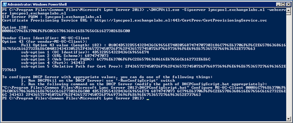 This information can be used to configure the DHCP options and the DHCPUtil tool can be used for this as well, but you have to run it locally on the DHCP server. Be aware that you need to install the Microsoft Visual C++ Redistributable on the DHCP server (can be found on the Lync DVD in the \setup\amd64 directory and is called vcredist_x63.exe). Copy the DHCPUtil.exe and DHCPConfigScript.bat to a directory on the DHCP server and enter the following command: