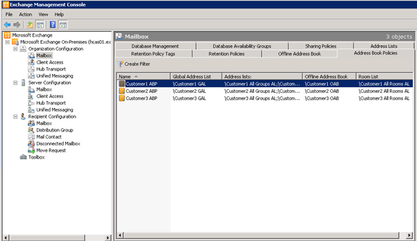Clearly visible are four Address Lists plus a Global Address List per customer. Since PowerShell is used there are consistent results during creation. Also the Address Book Policies now show up in the Exchange Management Console: