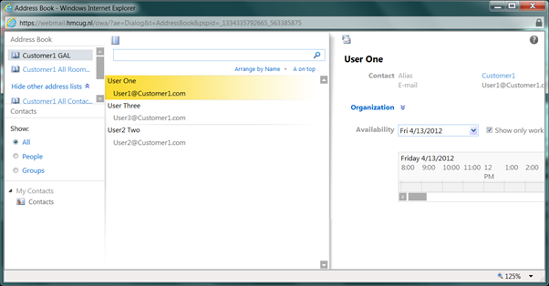 Logon as the user (using OWA) and check the Address Book. Only the Address Book of the user’s company should be clearly visible.