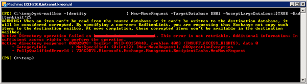 During an Exchange 2003 to Exchange 2010 migration I ran into an issue where the mailbox could not be moved to Exchange 2010 because of an “Insufficient Access Rights” error: