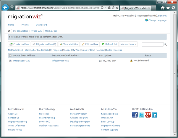 After creating an account via the website (http://www.migrationwiz.com) and acquiring the licenses you can logon to the Migrationwiz dashboard.