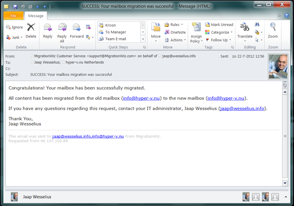 After the migration a status message is sent again, both to the migrated mailbox and the administrator (both are configurable though).