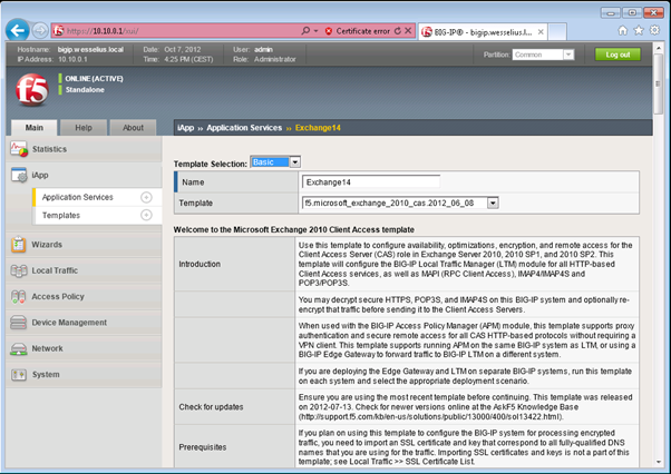 It is possible to create the VIP manually, but then you have to create the monitors (responsible for monitoring the server health), nodes, pools and virtual server yourself. And you have to configure all options for distribution and persistence yourself. Although this is doable (I know people actually doing this) I always recommend to use an F5 iApp. This is a predefined template with all settings regarding load balancing an Exchange 2010 environment. There are iApps on the F5 but it’s a best practice to download the latest iApp from the F5 website and install this on the load balancer.