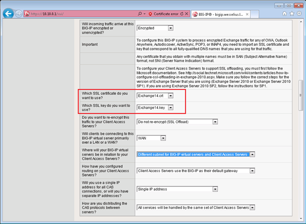 A set of important questions on how the client traffic arrives at the load balancer. This will be encrypted. The URL will be https://webmail.exchange14.nl/owa (for OWA) so the Exchange14 SSL certificate has to be uploaded in advance. Once uploaded it can be selected in the wizard. The traffic from the load balancer to the CAS servers will be unencrypted using port 80. Do not forget to enable SSL offloading on the Exchange 2010 CAS servers! For more information check my blog post SSL Offloading with Powershell.