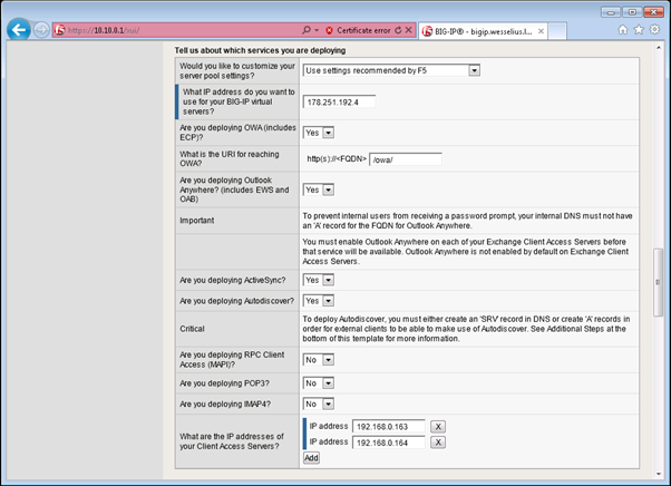 Next set of questions is what services are actually being deployed. First enter the IP address of the VIP (178.251.192.4 in our scenario, this should be on the ‘outside’ network of the load balancer) and select the various services that you want to deploy like OWA/ECP, ActiveSync, Autodiscover, Outlook Anywhere and RPC Client Access (for MAPI clients).