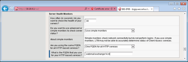 The last section is about how to configuring service monitoring which is the F5 actually checking if the various services on the Exchange 2010 are still fully operational. If you select Use simple monitors the service monitoring will be straight forward, the only thing that needs to be configured is how often the servers need to be checked (30 seconds is default) and the FQDN that’s being used (webmail.exchange14.nl) for accessing the HTTPS based services.