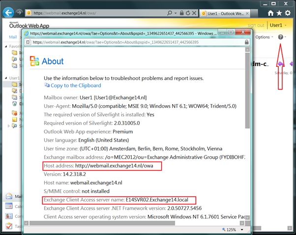 The SERVER01 is shown by modifying the logon.aspx page on the CAS servers. Check out Jeff Guillet’s blog on how to do this. When you want to check what server you’re actually logged on to just click the question mark in the upper right corner and select about.