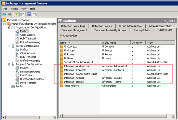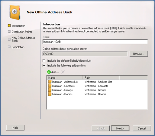 Also an Inframan specific Offline Address Book is created containing the earlier created Address Lists: