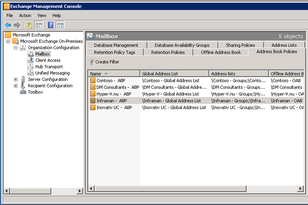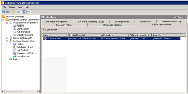 Figure 5. The new ABP showing up in the Exchange Management Console. Notice the new Address Book Policies tab.