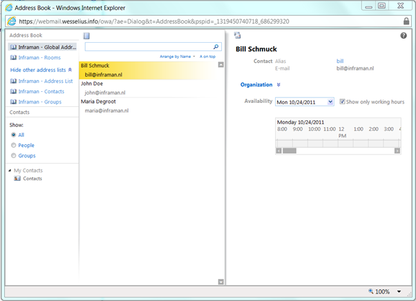 These company specific Address Book Policies are now assigned to users of the individual companies. When logging on as a user for example in the Inframan company only the Inframan specific Address Lists (and thus mailboxes) are visible. None of the other Address Lists and mailboxes available on this particular Exchange environment show up at all: