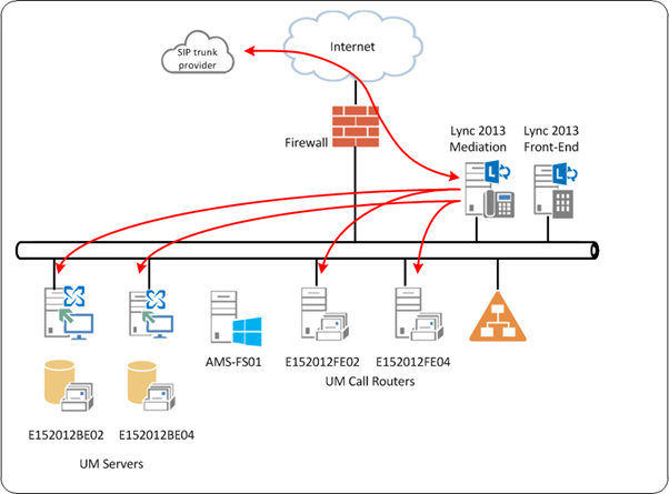 The situation will become something like this (I’ve removed the HTTPS proxying lines between the CAS and the Mailbox server). There’s a connection between the SIP trunk provider and the Mediation server for enterprise voice. When a user does not answer the call it gets routed from the Lync Front-End server to one of the Client Access Servers which contain the UM Call Router service. The CAS server determines the mailbox server that hosts the active copy of the user’s mailbox database and redirects the SIP traffic to the UM service that’s part of this mailbox server: