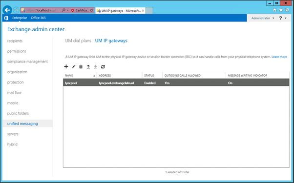 When the script has run you’ll see a new UM IP Gateway appear in the EAC. Since this script not only creates the UM IP Gateway but also sets the necessary permissions the UM IP Gateway was not created manually in the first step.