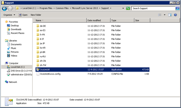 The next step is to run the OcsUmUtil.exe utility which creates the contact objects for Outlook Voice Access and for the auto attendants. This tool can be found in C:\Program Files\Common Files\Microsoft Lync Server 2013\Support.