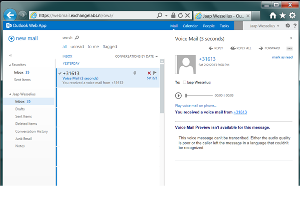The last and most exciting part (and least used I’m afraid) is to connect the two platforms into the Exchange 2013 Unified Messaging server role. If a call cannot be answered it’s rerouted into the Exchange server’s UM role where a voicemail can be recorded. This voicemail is then delivered into the user’s mailbox.