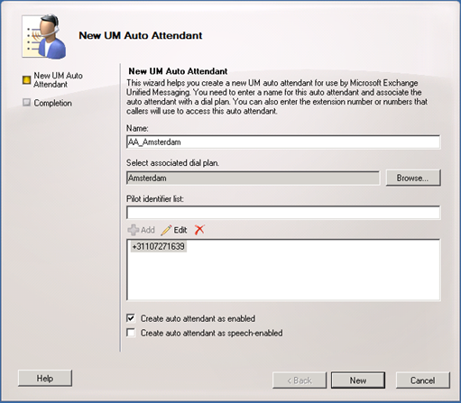 Click New to create the new Auto Attendant and click Finish to close the wizard.