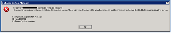 – One or more users currently use a mailbox store on this server. These users must be moved to another mailbox store on a different server or be mail disabled before uninstalling this server.