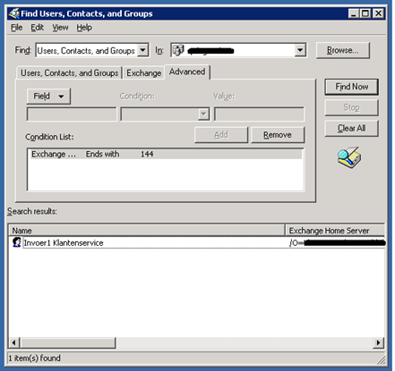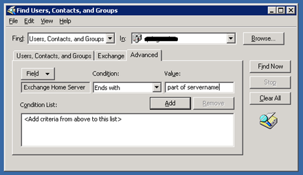 Open Active Directory Users and Computers (on the Exchange 2003 Server) and start the Find option. In the Advanced tab select Exchange Home Server in the Field drop-down box, select Ends with in the condition drop-down box and in the value type the last part of the Exchange 2003 server name.