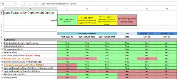 Microsoft has released an overview with the features and functionality that are supported (either by Microsoft or by a 3rd party vendor) or not supported in OCS, Lync 2010/2013 On-Premises and Lync Hosting Pack v1 and v2.