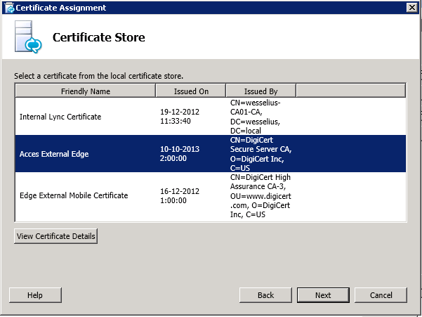 A Lync 2013 Edge server is using external, 3rd party certificates for authentication and encryption of data for federation purposes and external clients connecting to the Lync 2013 environment. I’m using Digicert certificates for this since these work fine in almost all situations.