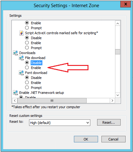 To change the settings click on Custom Level. In the Internet Zone Security Settings window scroll down to the Downloads section. Select the Enable radio button and click OK to save the new configuration.