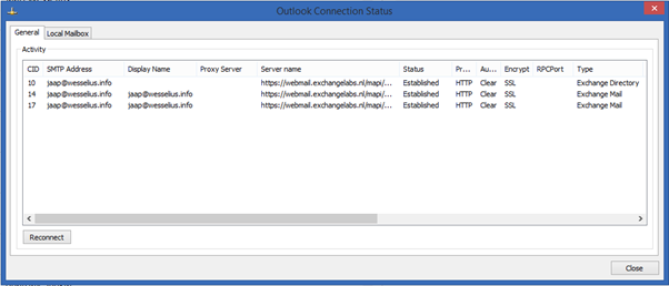 When you check the Outlook connection after restarting you’ll see the change. A Proxy server is no longer used and the servername is replaced to a URL pointing directly to the Mailbox: