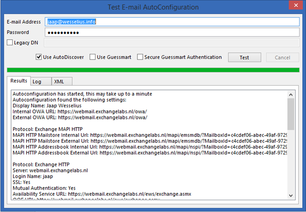 You can check the server configuration by retrieving the Autodiscover manifest. You can do this using the Test E-mail Autoconfiguration option in Outlook. You’ll see the MAPI HTTP information returned from the Exchange server at the top of the manifest. The ‘old’ information is still returned as well for older Outlook clients that are still running Outlook Anywhere.