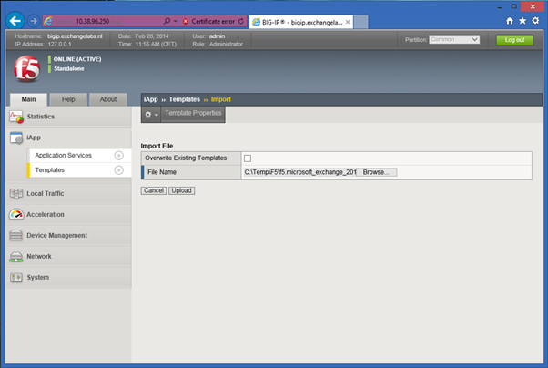 To import the iApp template we just downloaded open the LTM web console and navigate to iApp | Templates and click the + icon. Use the Browse button to locate the Exchange 2013 template file we just downloaded and click Upload as shown in the following figure.