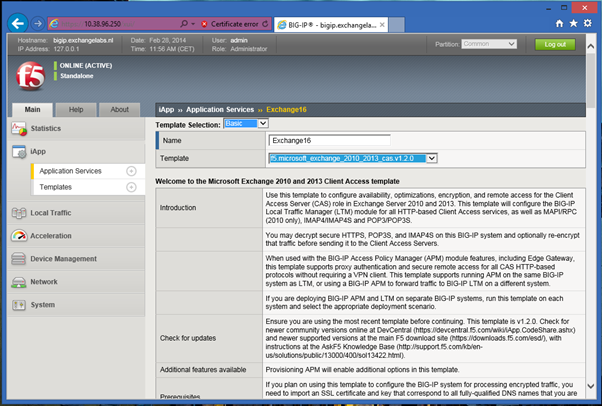 At the moment of writing (just after the release of Exchange 2013 SP1) the template is not supporting Exchange 2013 SP1 but we’ll reconfigure the iApp later on for usage with SP1.