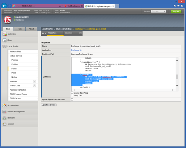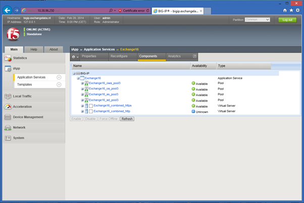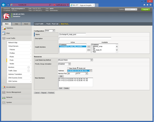 I assume you already have configured the Exchange 2013 SP1 servers for SSL offloading. The first we have to do is configure the LTM and create a new VIP or iApp in F5 terminology.