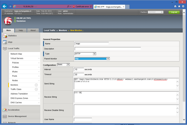 To create a MapiHttp monitor navigate to Local Traffic | Monitors and click the + icon. Enter a name like Exchange16_mapi_http_monitor and select HTTP in the Type dropdown box. Change the Interval to 10 seconds, the Timeout to 31 seconds and enter the following in the Send String: