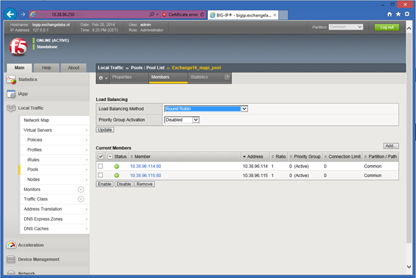 You can also check the pool itself on the LTM by navigating to Local Traffic | Pools | Pool List and select the Exchange16_mapi_pool we’ve created earlier. The green dots show the availability of both Pool members (i.e. the /mapi Virtual Directory on each Client Access server):