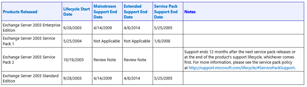 - Exchange Server 2003: http://support.microsoft.com/lifecycle/search/default.aspx?sort=PN&alpha=exchange+server+2003&Filter=FilterNO