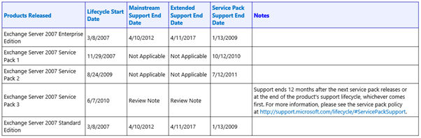- Exchange Server 2007: http://support.microsoft.com/lifecycle/search/default.aspx?sort=PN&alpha=Exchange+Server+2007&Filter=FilterNO