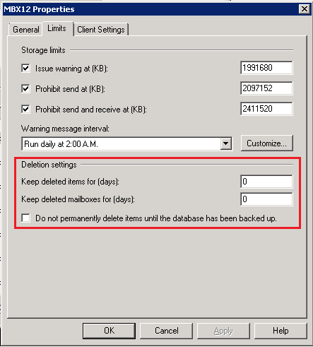Next step was to permanently delete the disconnected Mailboxes from the Mailbox database. To achieve this set the Keep deleted items and Keep deleted mailboxes both to “0” as shown in the following figure: