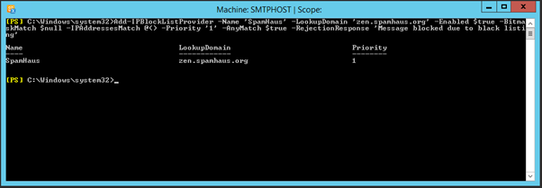 Add-IPBlockListProvider -Name ‘SpamHaus’ -LookupDomain ‘zen.spamhaus.org’ -Enabled $true -BitmaskMatch $null -IPAddressesMatch @() -Priority ‘1’ -AnyMatch $true -RejectionResponse ‘Message blocked due to black listing’