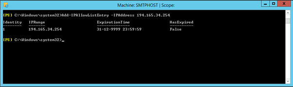 The IP Address of the server is added to the IP Allow List of the Edge Transport Server by entering the following command: