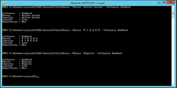 Add-ContentFilterPhrase -Phrase ‘Online Casino’ -Influence BadWord