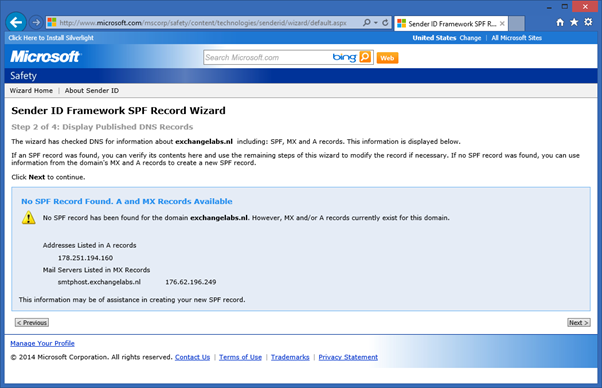 - The wizard then determines there’s no SPF record and retrieves the IP address for the domain (exchangelabs.nl) and its MX record: