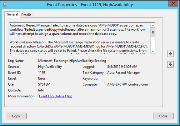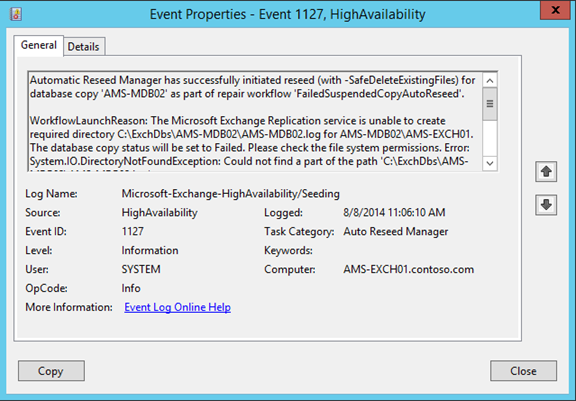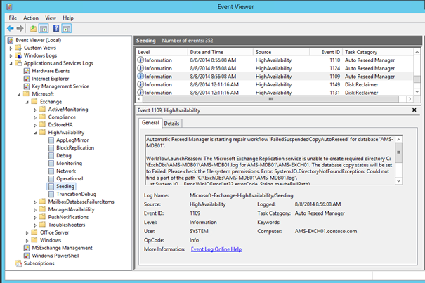 The first event that’s logged is EventID 1109 from the Auto Reseed Manager, indicating that something is wrong and that no data can be written to location C:\ExDbs\AMS-MDB01\AMS-MDB01.log. This makes sense since the disk has actually ‘failed’ and is no longer available.