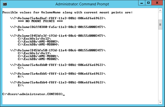 You can use the mountvol utility again to check the new configuration. If all went well you’ll see the Mailbox databases now on Volume 3 as shown in the following figure: