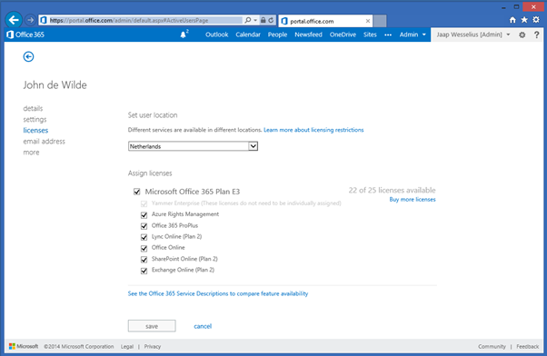 You can assign a license to a user using the Microsoft Portal, just select the user and in the Action Pane select License. Depending on the licenses you got available you can assign it (in this example an E3 license) and set the user’s location (in this example Netherlands):