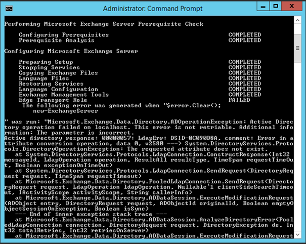 “Microsoft.Exchange.Data.Directory.ADOperationException: Active Directory failed on localhost. This error is not retriable. Additional information: the parameter is incorrect.” And “Active Directory response: 00000057: LdapErr: DSID-0C090D8A, comment: Error in attribute conversion operation, data 0, v2580 —> System.DirectoryServices.Protocols.DirectoryOperationException: The requested attribute does not exist.”