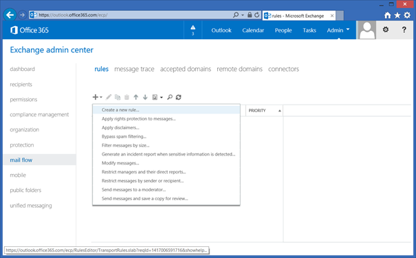 In Office 365 auto-forward is enabled by default on an organizational level, but can be disabled on a tenant level by using Transport Rules. To achieve this, logon to the Exchange Admin Center of Office 365 (https://outlook.office365.com/ecp/) and select Rules in the Mail Flow section.