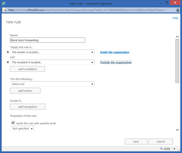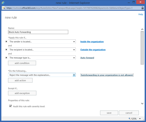 Click Save to store the new Transport Rule that blocks auto-forwarded messages for your organization.