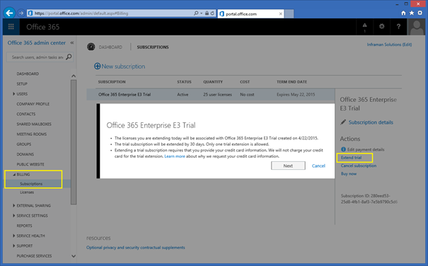 To extend the trial subscription you need to enter your credit card details, but your card won’t be charged for extending the trial period. In the pop-up windows, click Next and in the following windows enter your credit card details. Once entered click Extend trial and you’re good for another 30 days.